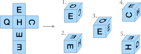 過年期間,Nalyd一家人在家中賭骰子。 Nalyd從口袋中拿出了一顆骰子,和家人玩起了猜字母遊戲。 Nalyd拿出的骰子,每一面上各有一個英文字母, 下...